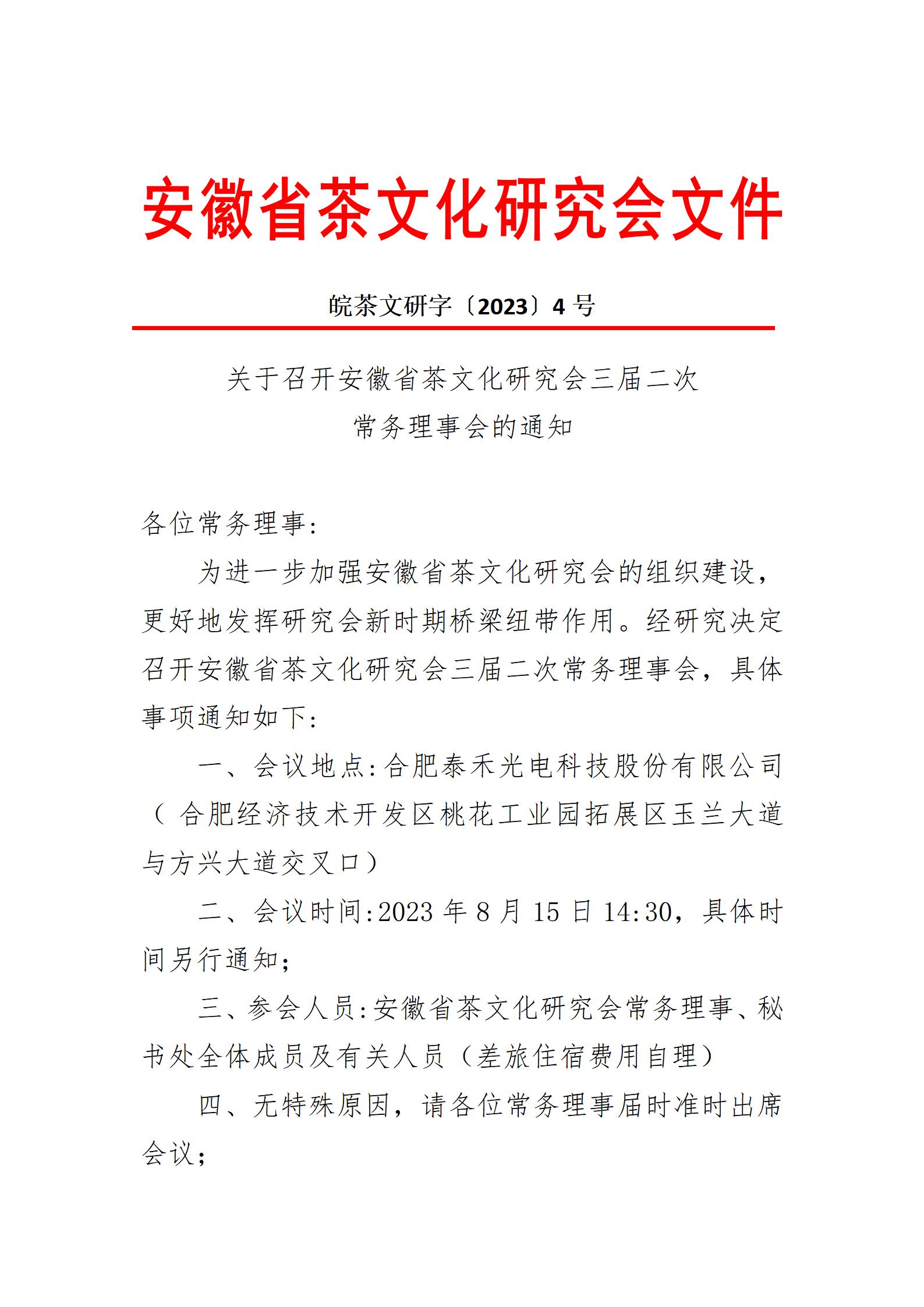 关于召开安徽省茶文化研究会三届二次 常务理事会的通知